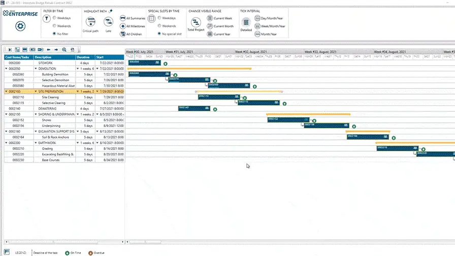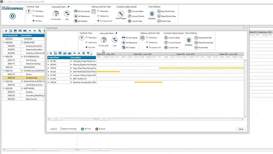 - View start date to completion date, percentage of project completion, and critical and non-critical activities.